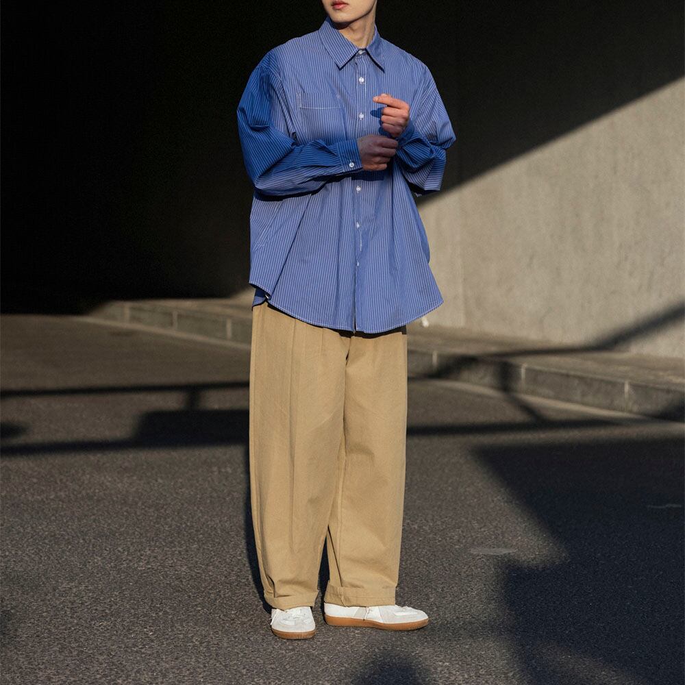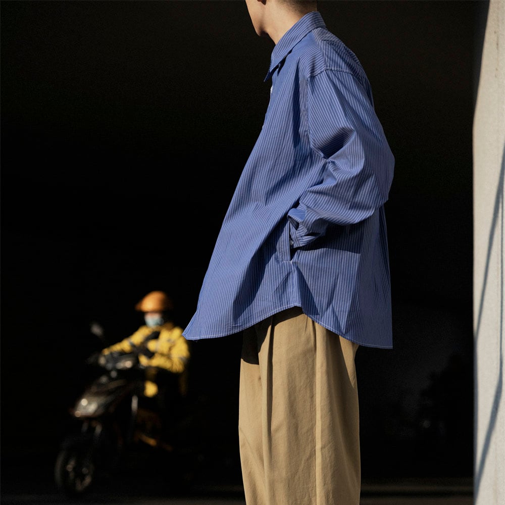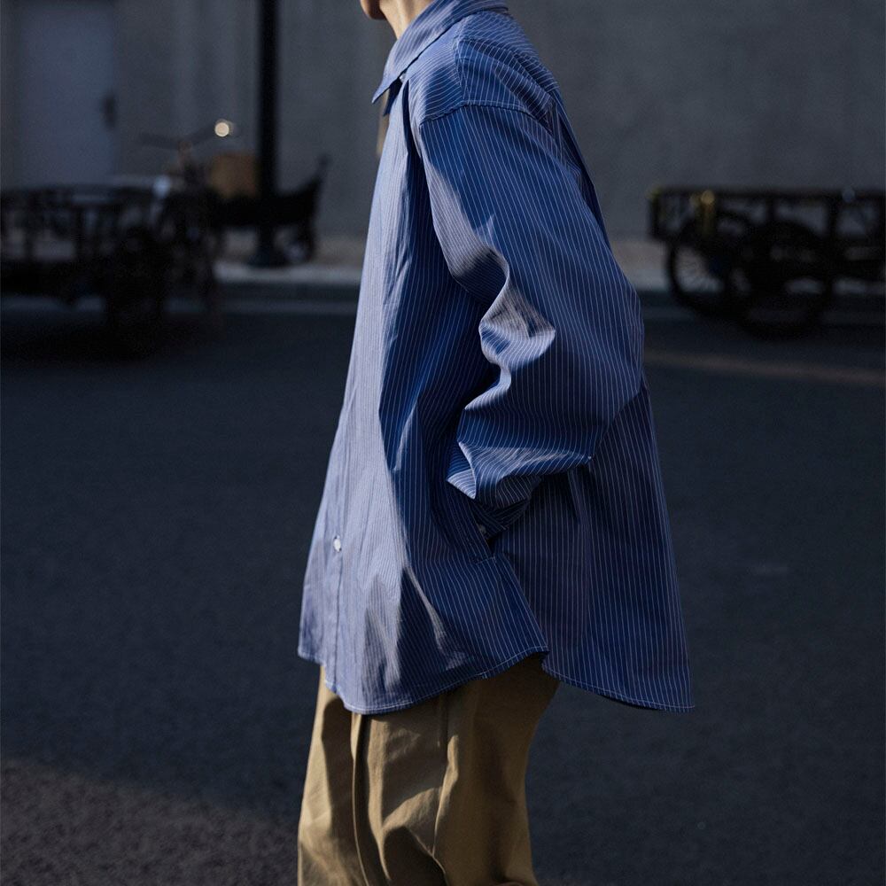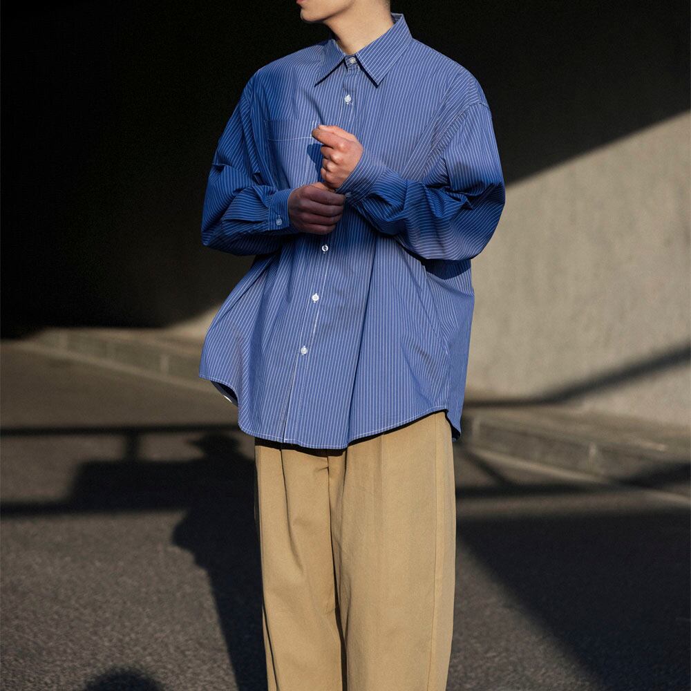 ルーズなシルエットと洗練されたストライプが魅力のメンズシャツです。